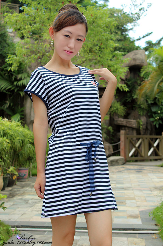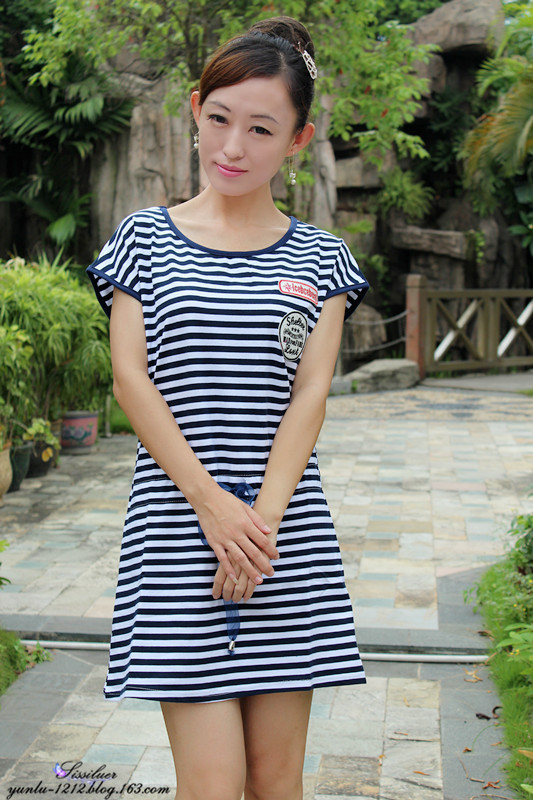 海军风格的横条连衣裙,简单的款式,收腰的丝带系带的设计,