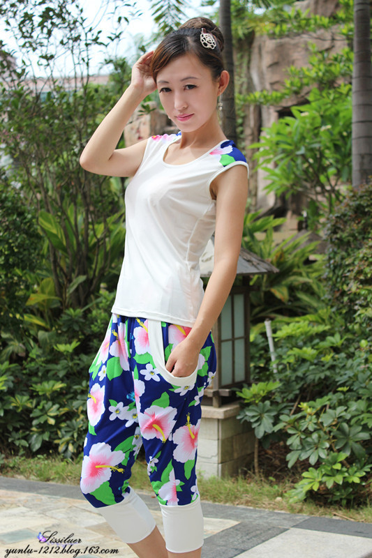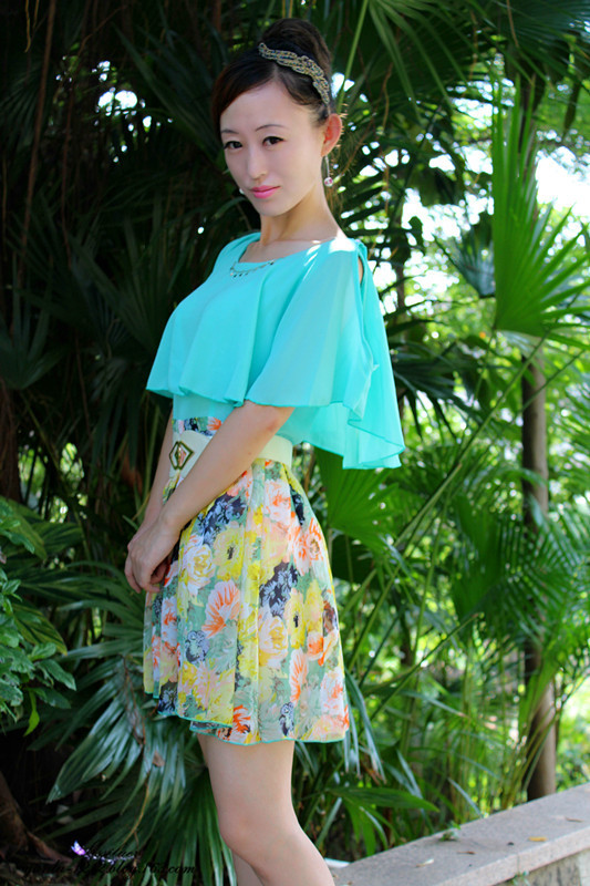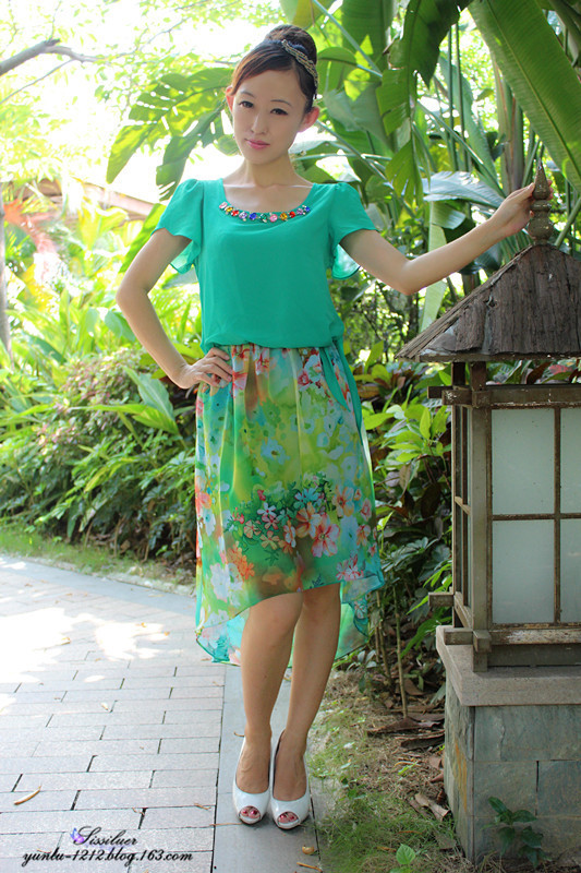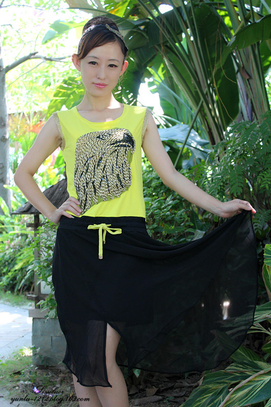 黄色艳丽的上身,飘逸的荷叶边的感觉,花色的裙子,