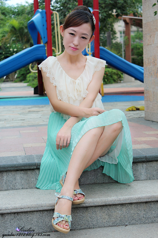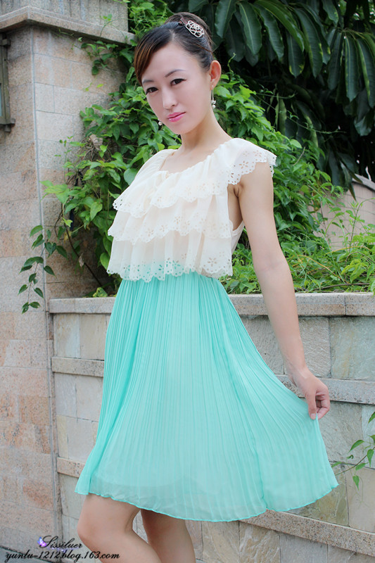 蕾丝花边的三层设计,加上嫩嫩的绿色百褶裙,连体的款式,