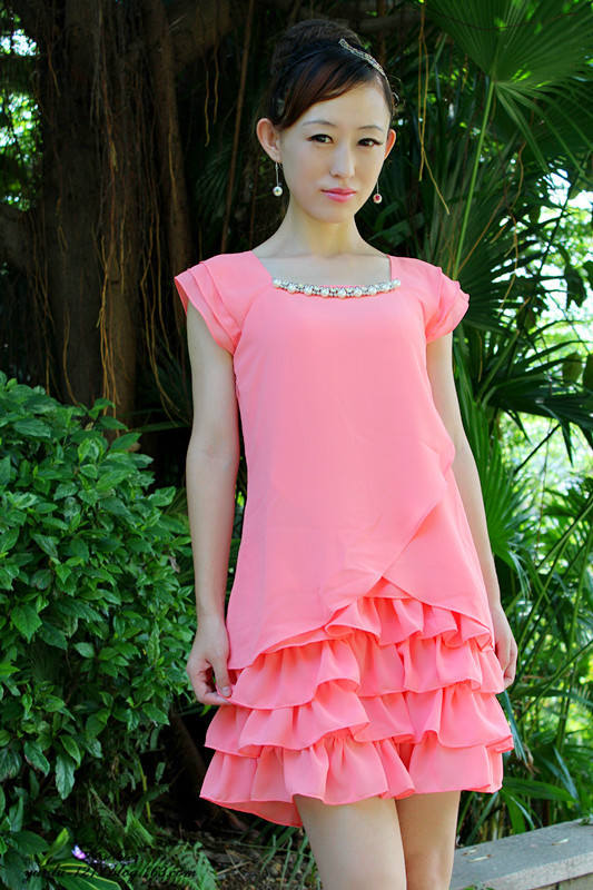 喜欢粉色,显得很粉嫩的感觉,蛋糕裙的下摆,领子的装饰效果,修身的设计,