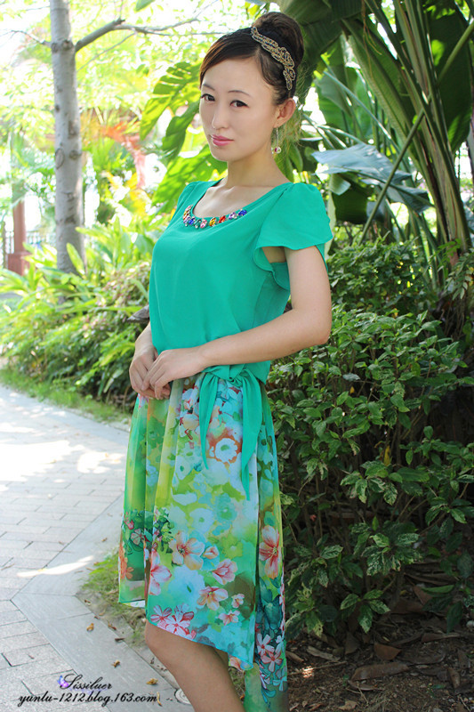 搭配花色的裙子,腰带的设计,整体显得修身,美丽,别致的装饰效果,整体感觉很女人