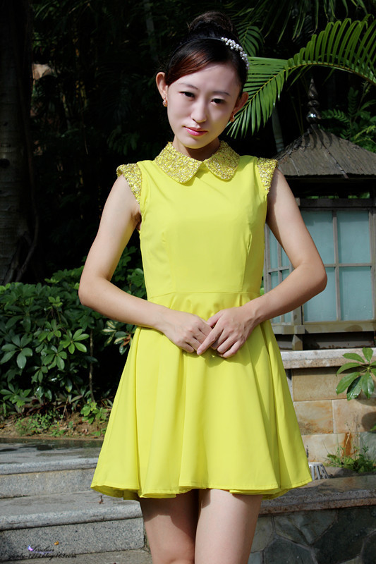 夏季流行的荧光色,亮片的娃娃领也显得装扮的非常的美丽