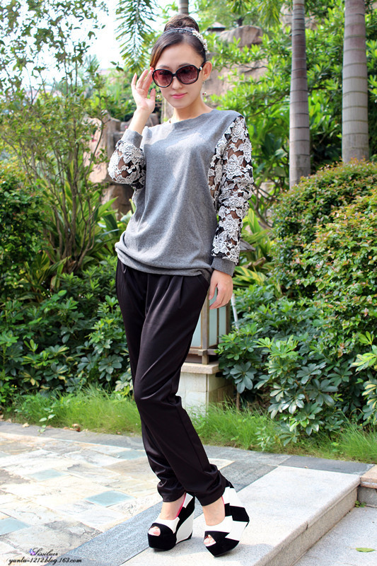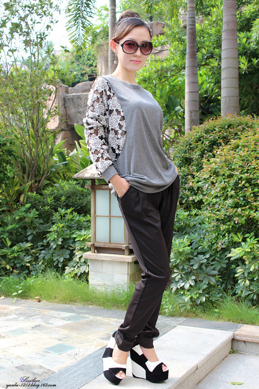 休闲的哈伦裤,宽松的蕾丝上衣,随意的搭配,黑白结合的松糕鞋