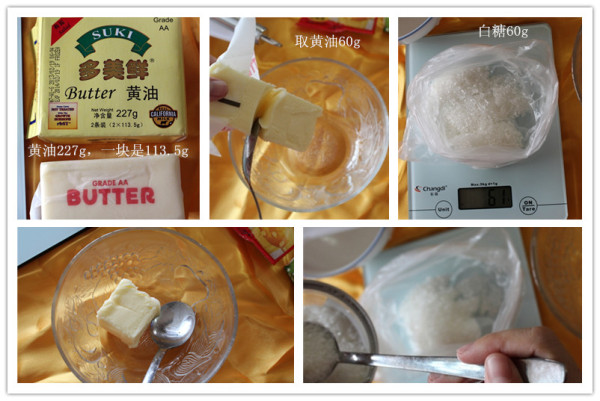 因为第一次制作,所以取了大概数量的黄油二分之一块,糖粉60g左右,