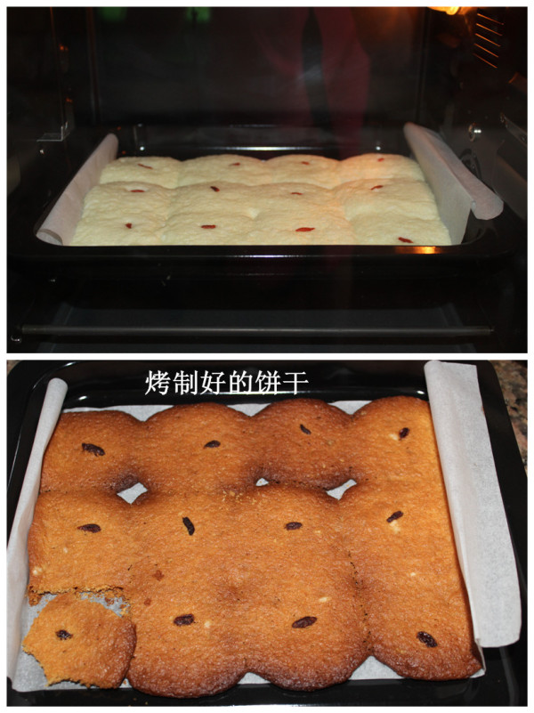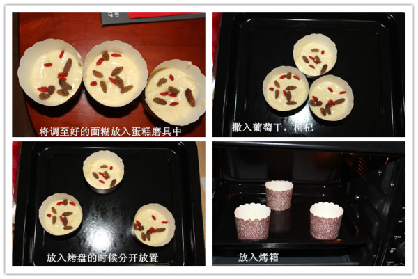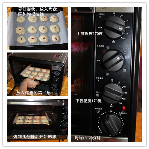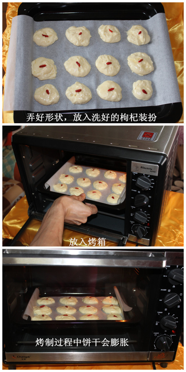 把面糊弄成一个一个形状,放入烤盘中,表面用枸杞装饰