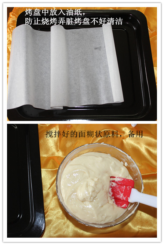 面糊搅拌好,成为糊状,准备好烤盘,备用,里面放入油纸,防止粘住不好清洁