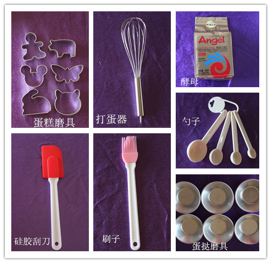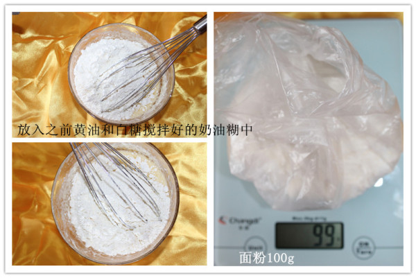 原材料:黄油65g,糖粉60g,全蛋30g,牛奶1勺,低筋面粉100g。泡打粉1/2勺。