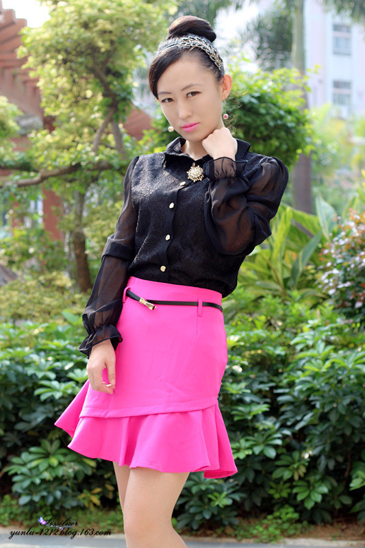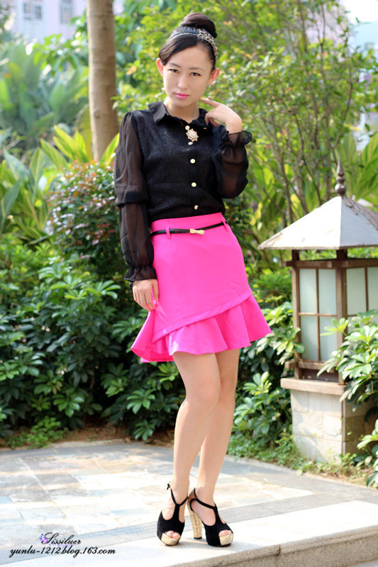 同色的裙子可以很多种搭配,搭配黑色的衬衣也不错的感觉