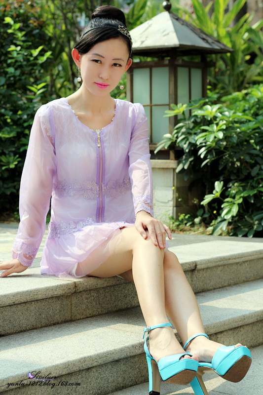 短款的裙子能显得腿很长,搭配蓝色的高跟鞋,不同的感觉呈现出来
