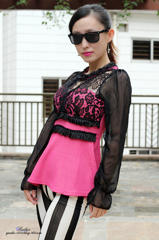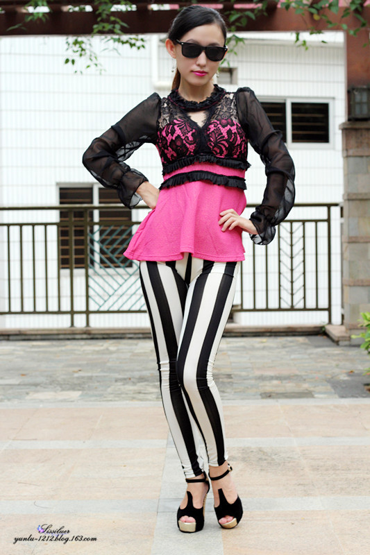 邓紫棋同款的条纹裤子,v领的蕾丝上衣