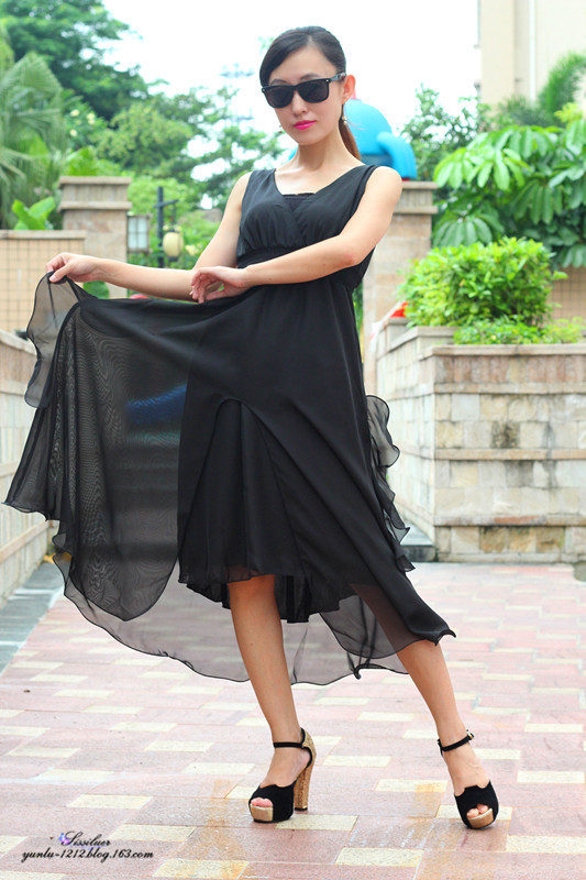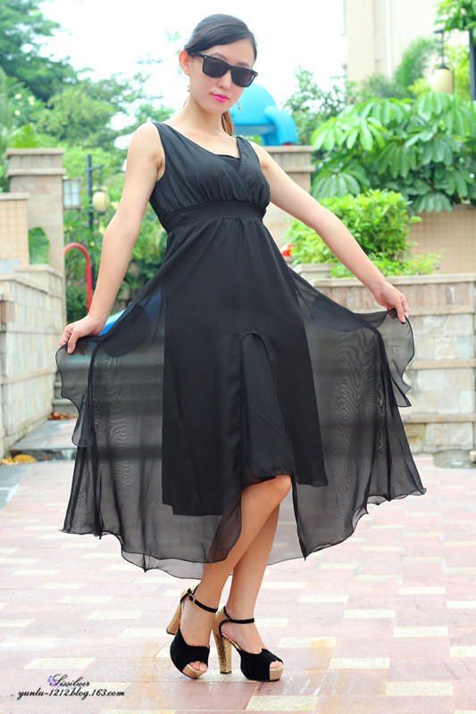 不规则的黑色雪纺连衣裙,搭配同色的黑色高跟鞋