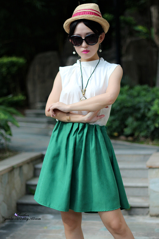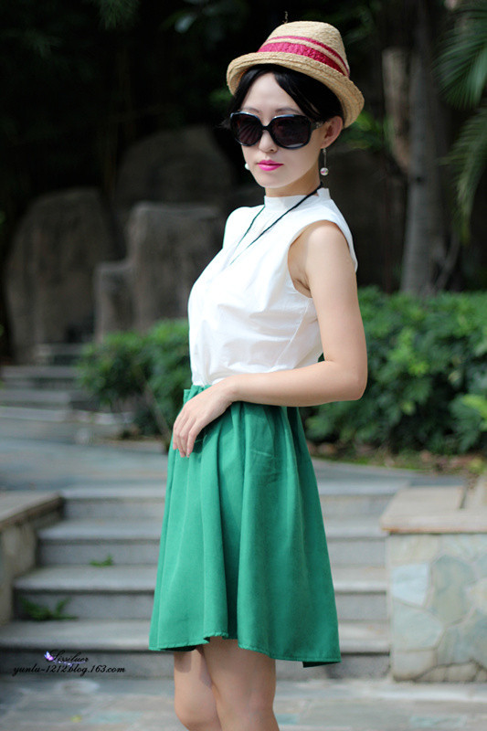 白色搭配清爽的绿色,夏季无袖设计的裙子是最招人喜欢的