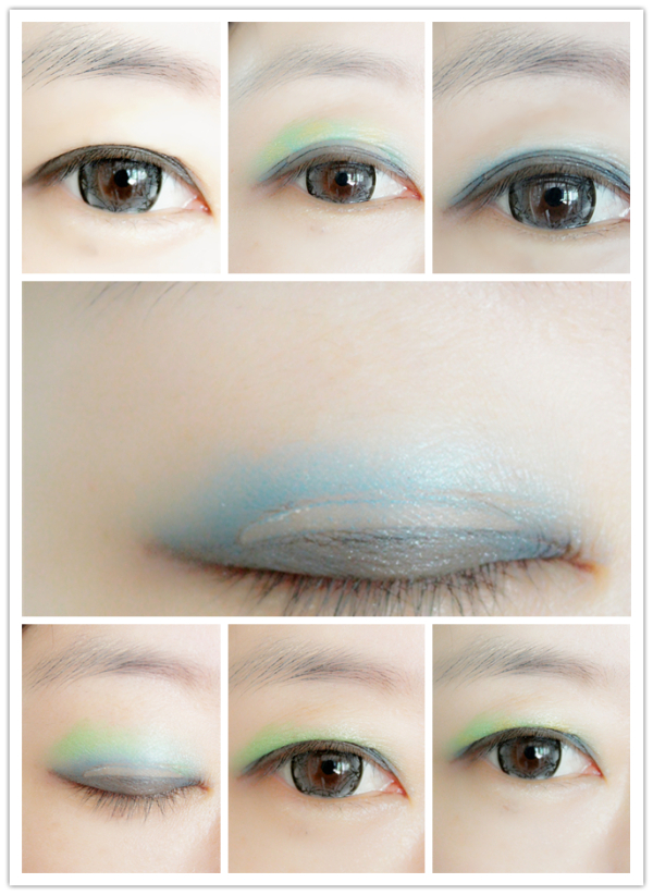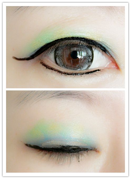 用到了双眼皮胶贴、美瞳、假睫毛、黄色、绿色、蓝色、黑色等颜色的眼影来打造