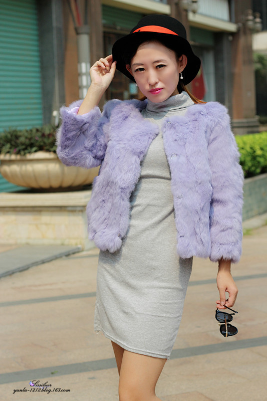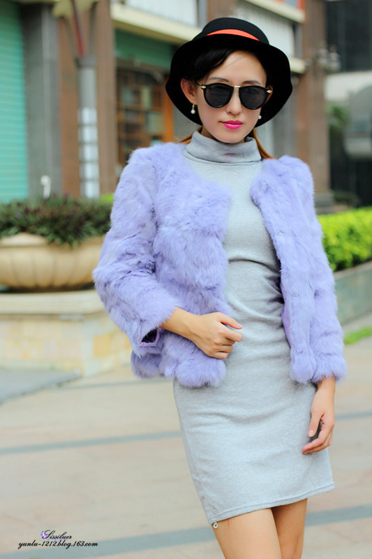 淡紫色是流行的颜色,搭配灰色的连衣裙,喜欢皮草毛绒绒的感觉