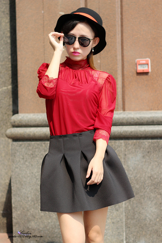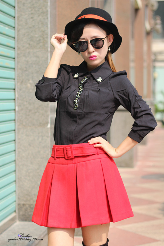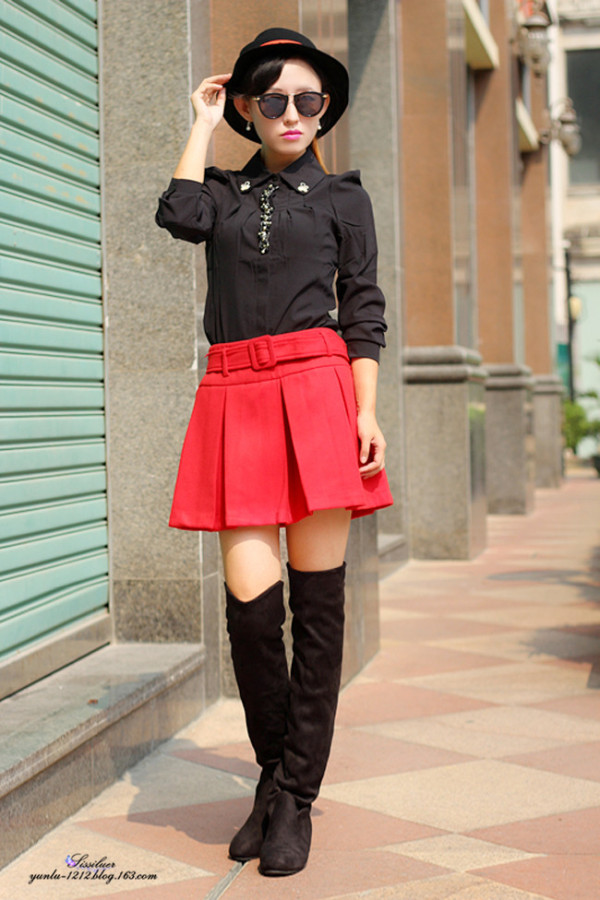 【黑色衬衣】 【红色短裙】 【黑色长靴】 【卡其风衣】 【红色蕾丝衬衣】