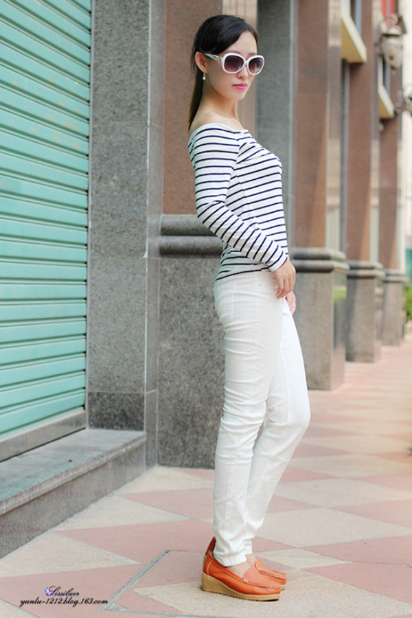露肩的横条上衣,简单的白色裤子,舒服的坡跟鞋,看似生活化的装扮