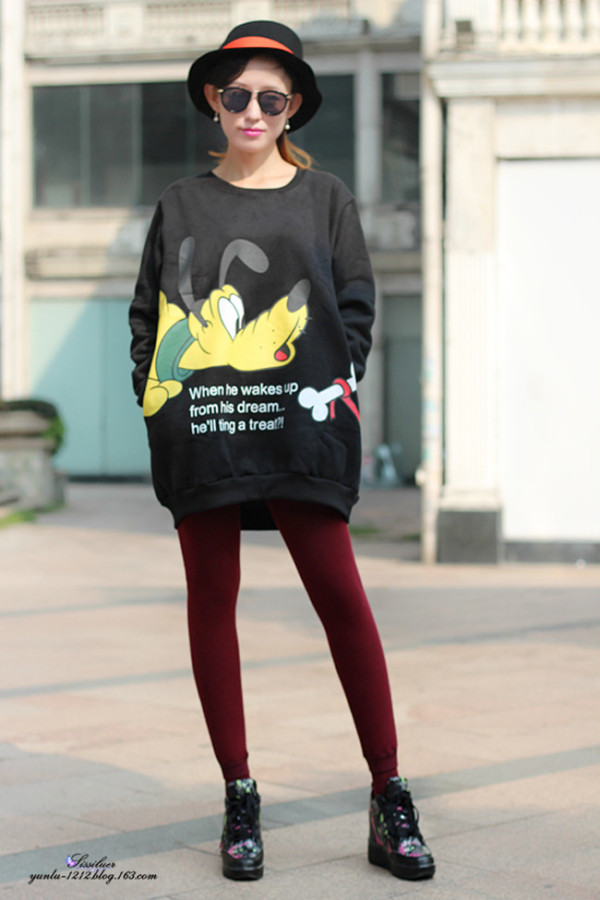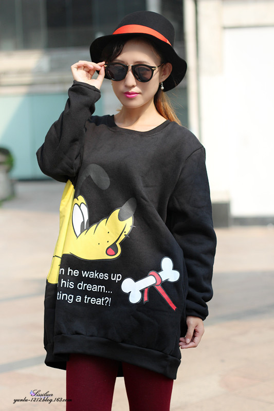 黑色加绒的可爱印花图案的上衣,宽松的设计