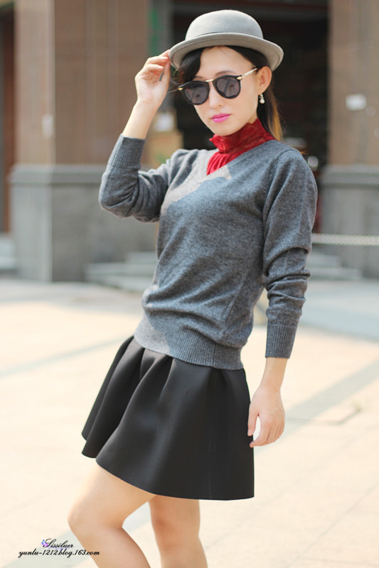 灰色的v领毛衣,简单的搭配也能穿出不同的感觉,黑色的靴子