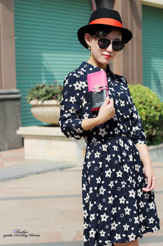 碎花的裙子,深蓝色耳钉底色,星星的图案,复古的红色皮包,单穿艳阳高照的季节不会觉得冷