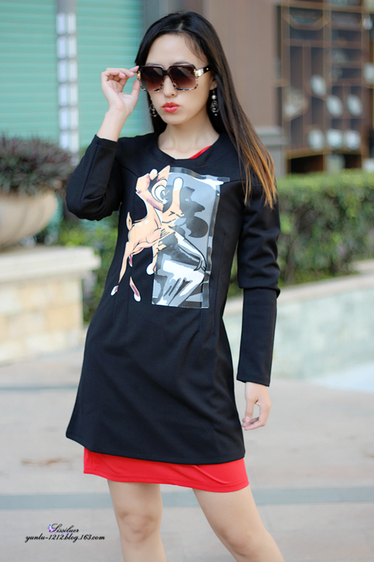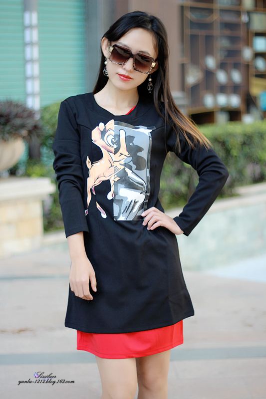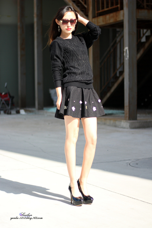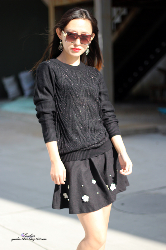 碎花装扮的裙子,黑色的长袖针织衫,就这样酷酷的,帅帅的把