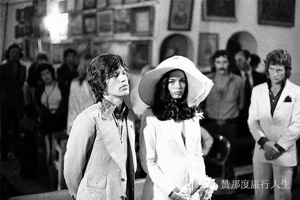 五月的南法小镇圣特罗佩阳光灿烂,The Rolling Stones(滚石乐队)的主唱Mick Jagger选择在这里和演员女友Bianca大婚。当天,两人一身定制的YSL:Jagger身穿西装三件套,而Bianca则一袭纯白吸烟装外套配长裙,胸线在白西装下若隐若现,她头戴一顶白色宽檐帽,脚蹬一双白色凉鞋。