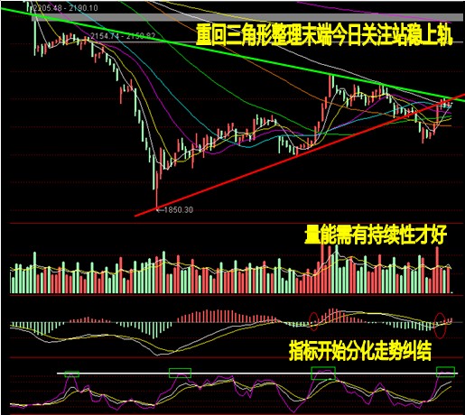 再看大盘的小时图走势,重回三角形的整理末端,可以说经过两日时间消耗,今日将做出一个选择,如果站上上轨压力就必须放量,否则还会下来,如果低开在下轨处,则需要关注随后半小时的走势。