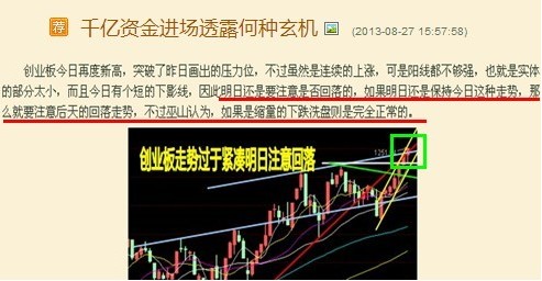 巫山在周二的收盘文章《千亿资金进场透露何种玄机》中对创业板的走势做了分析,认为创业板周三会出现调整,即使周三不调周四也会调整,并且画出了压力位,到现在来看,提示还是非常及时的。