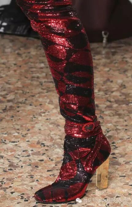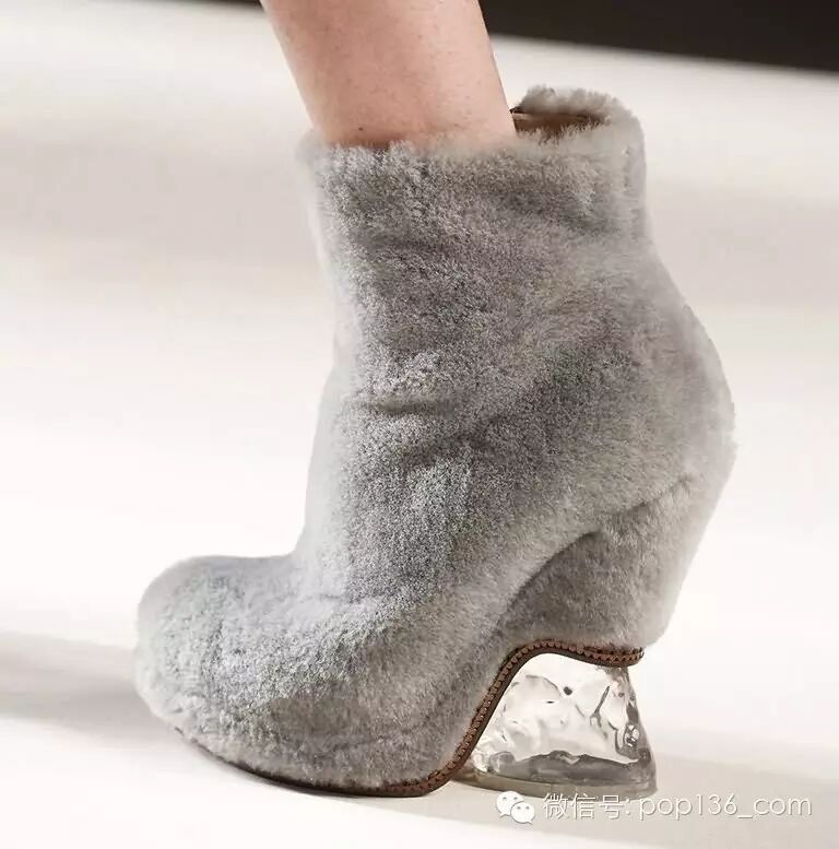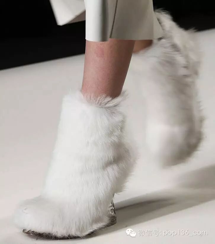 2015-2016秋冬Fendi发布会让我们仿佛身临冰天雪地,厚厚的绗缝填棉外套和皮草靴子散发出浓浓阿尔卑斯雪山风情。皮草和拼色是本季Fendi女鞋的主题。琳琅满目的长绒毛皮草坡跟靴是本季Fendi主打款,让这个冬天格外温暖,与整体造型相得益彰。别具一格的透明有机玻璃鞋跟为整个系列带来了一抹街头风。