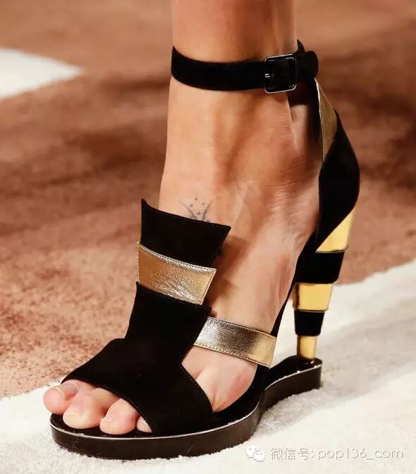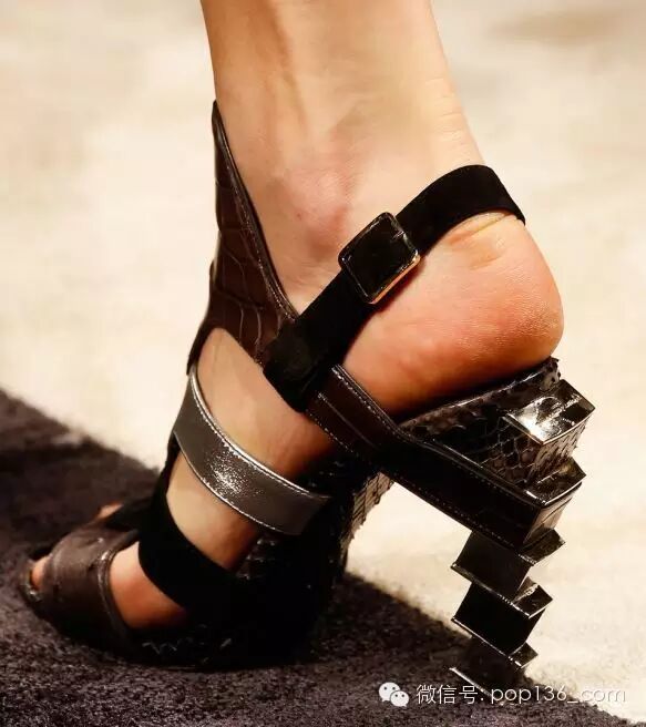 几何、色块和拼接是2015-2016秋冬SalvatoreFerragamo 系列女鞋的主题。跟型也是设计师重点表达的一部分,小方块构成的叠层鞋跟宛如宝塔或都市摩天大楼,为整个系列带来了摩登前卫感和别致的视觉效果。设计师称他的灵感源自穿山甲。