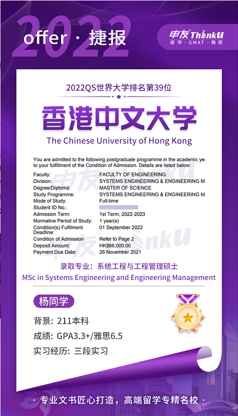 功夫不负有心人,Y同学9月底递交申请,10月底就拿到了香港中文大学项目管理推研信,11月份拿到的正式offer,一切都那么地顺其自然。