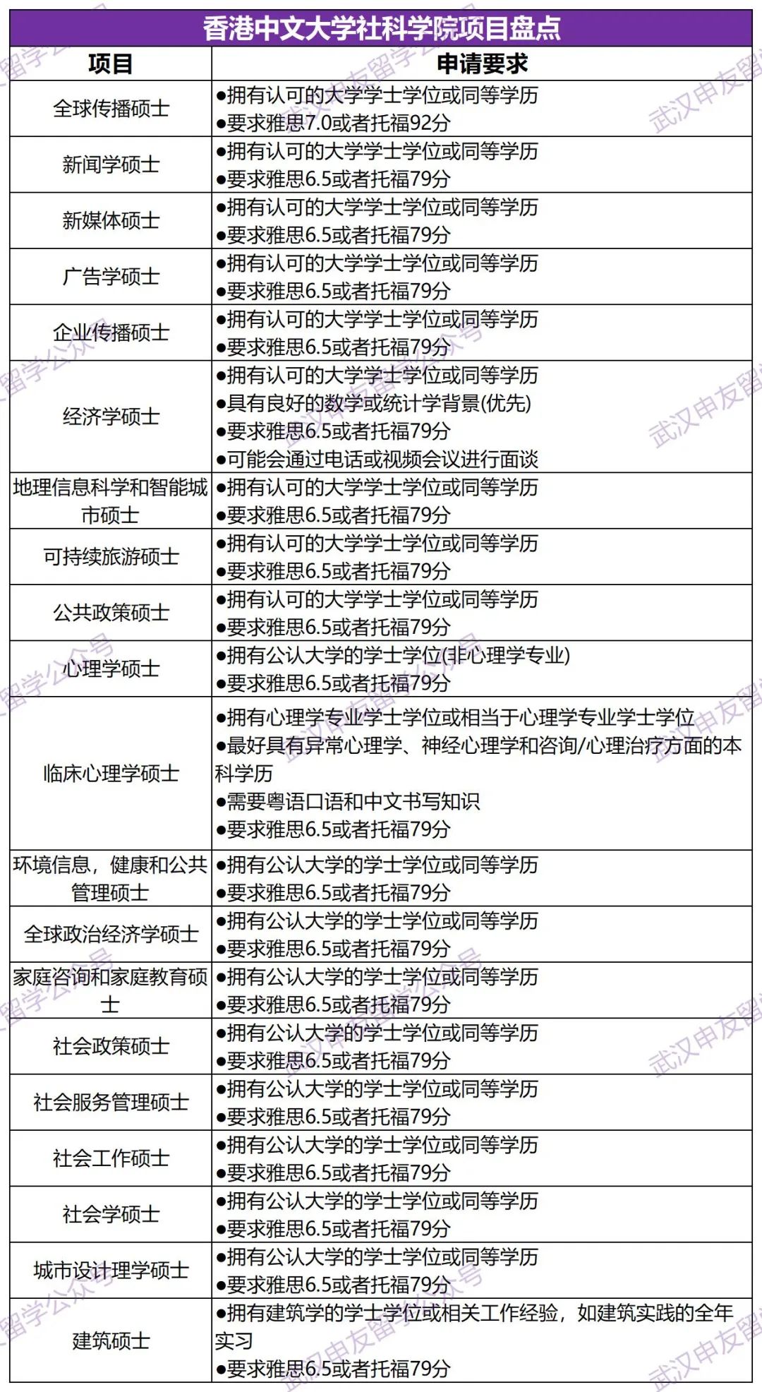 相对于港大和港科,港中大的人文社科下的项目相对更加丰富,官网给出的基本门槛相对也比较友好,整体都不太强调申请者的专业背景,雅思要求6.5或者托福79分,没有小分要求。