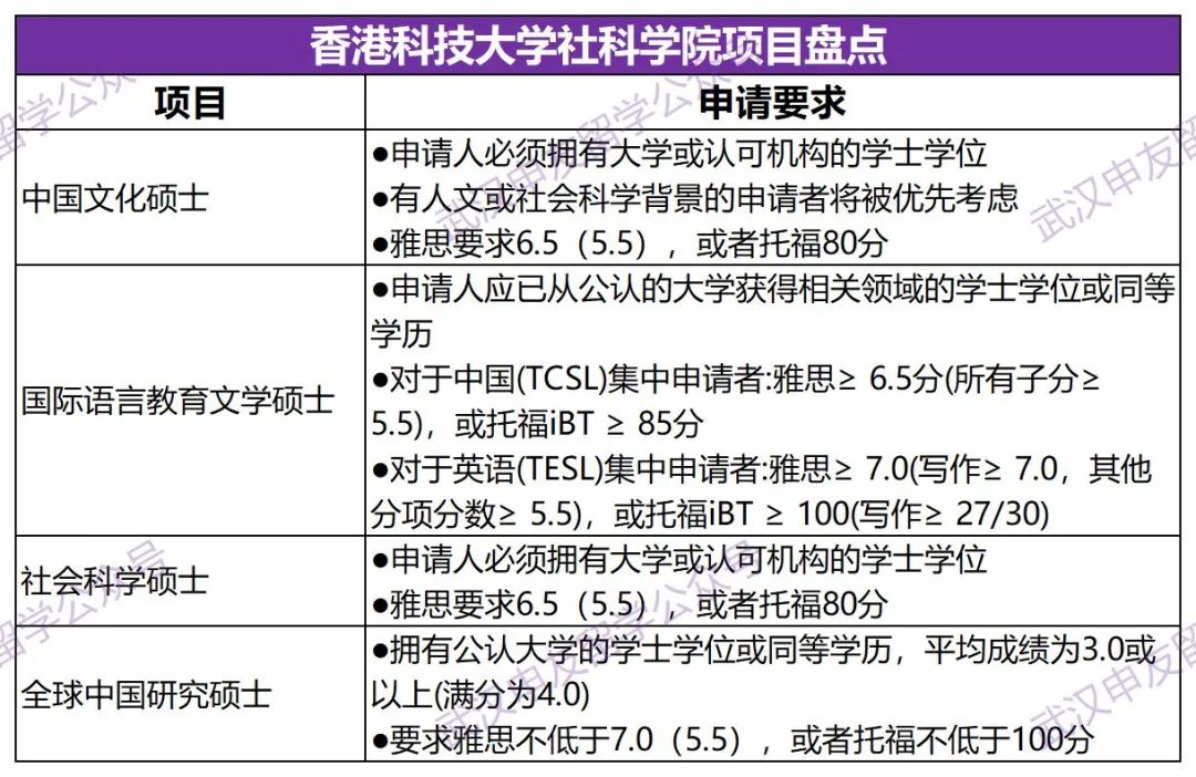 香港科技大学的社科专业开设的不多,主要是中国文化、国际语言教育、社会科学、全球中国研究。但就官网给出的基本信息,港科的社科申请比港大的要求更高,主要体现在语言要求上,要求雅思6.5+,且小分不低于5.5。
