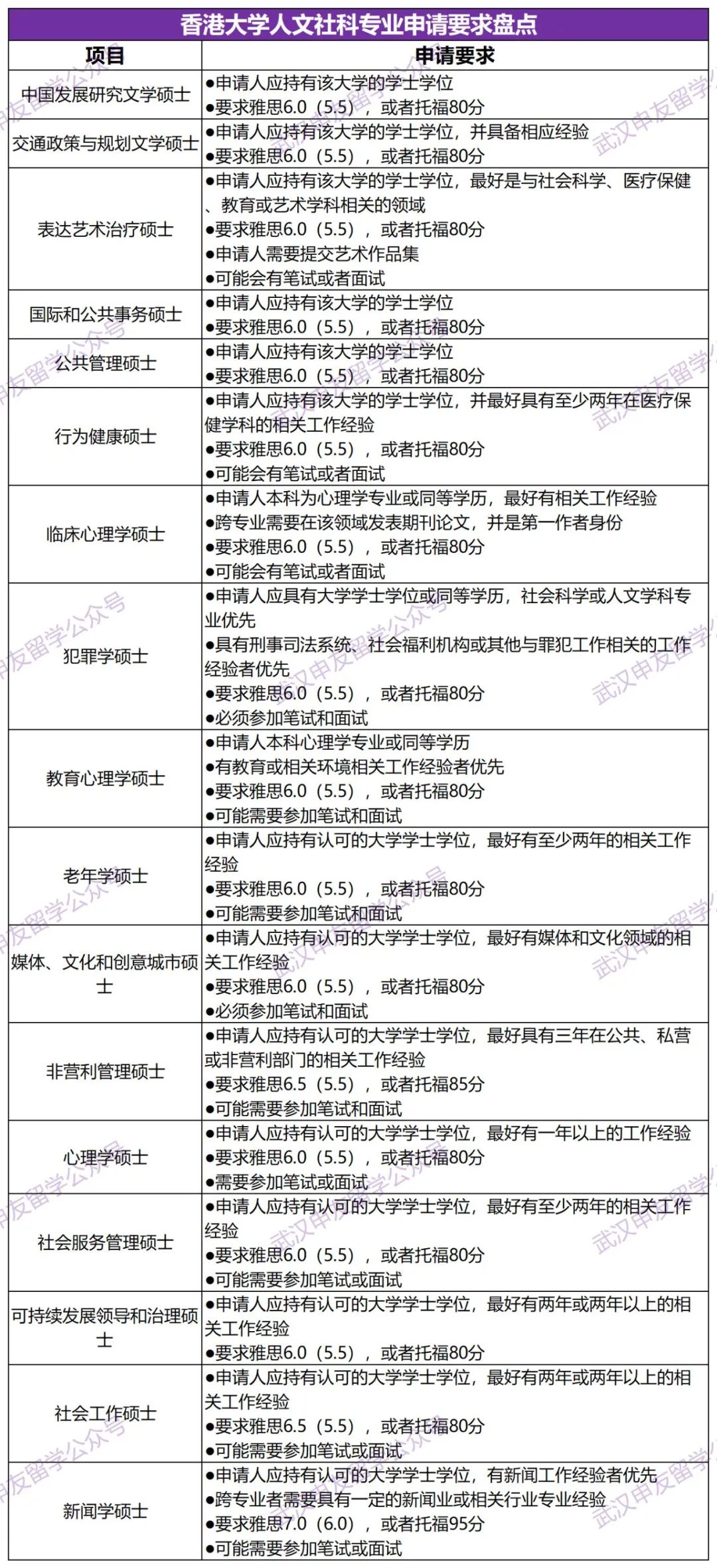 根据官网给出的基础信息,港大的大部分人文社科项目都需要具有相关的专业背景或者是一定的工作经历,对于跨专业申请并没有那么友好;在语言上,一般要求是雅思6.0(5.5),或老托福80分。
