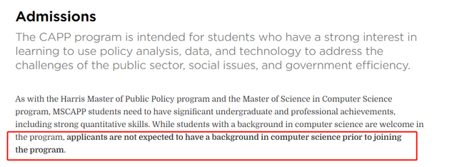 另外芝加哥大学计算机系还与公共政策学院合开的计算分析与公共政策(MS in Computational Analysis and Public Policy),面向对学习使用政策分析、数据和技术来解决公共部门、社会问题和政府效率的挑战有浓厚兴趣的学生,不需要任何计算机专业背景, 比较适合文科背景的人申请。