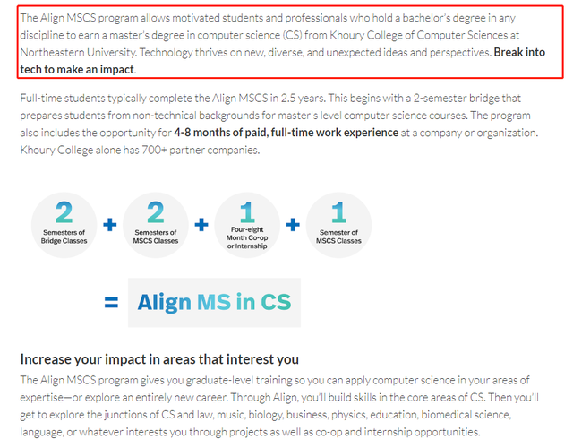 美国东北大学计算机学院针对转专业的学生专门设置了项目:Align MS in CS (For people new to CS)。相比其他项目,该项目多了四门计算机的基础课程,包括计算机基础离散结构、计算机系统/算法和面向对象的语言,且在西雅图、波士顿和硅谷都有校区,地理优势明显。