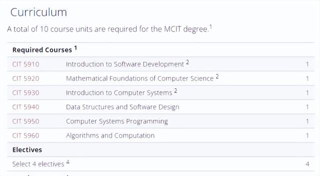 该项目主要有5门必修课:计算机科学数学基础、计算机系统概述、数据结构和软件设计、软件发展概述以及计算机系统编程和算法等。历届录取学生的背景很多样化,包括法律、数学、文学、历史、化学、医学等。