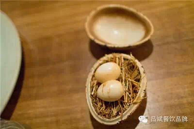 第九道,蛋中蛋,是NOMA的特色菜,烟熏过的鹌鹑蛋装在特制的蛋型容器之中,下面草垛一样的材质也是可以吃的。