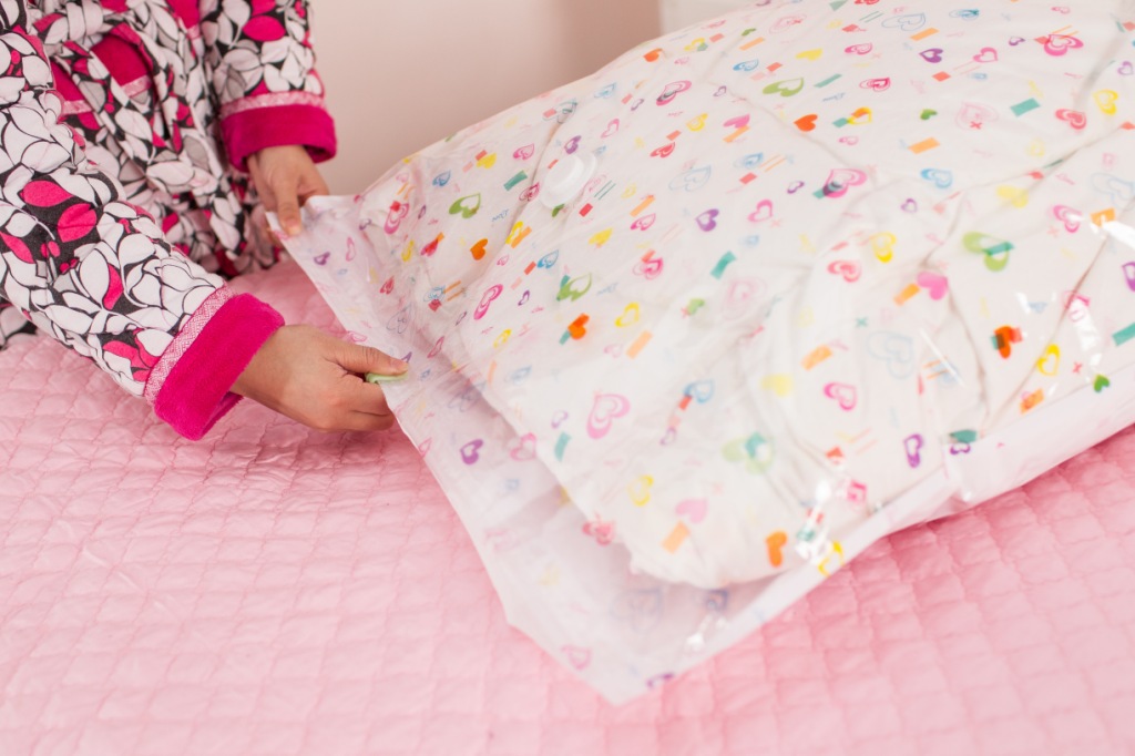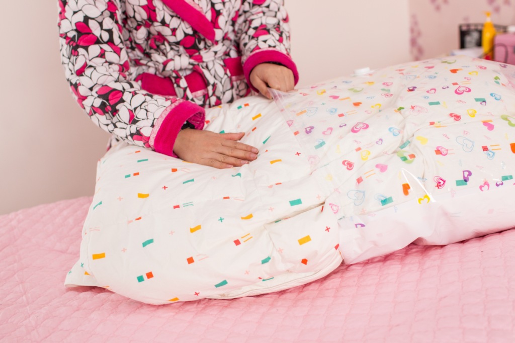 1. 把袋子打开,把被子或者衣物整理好后装进去。