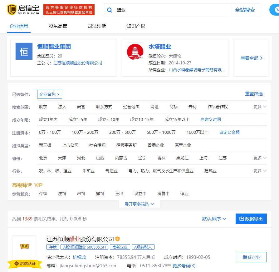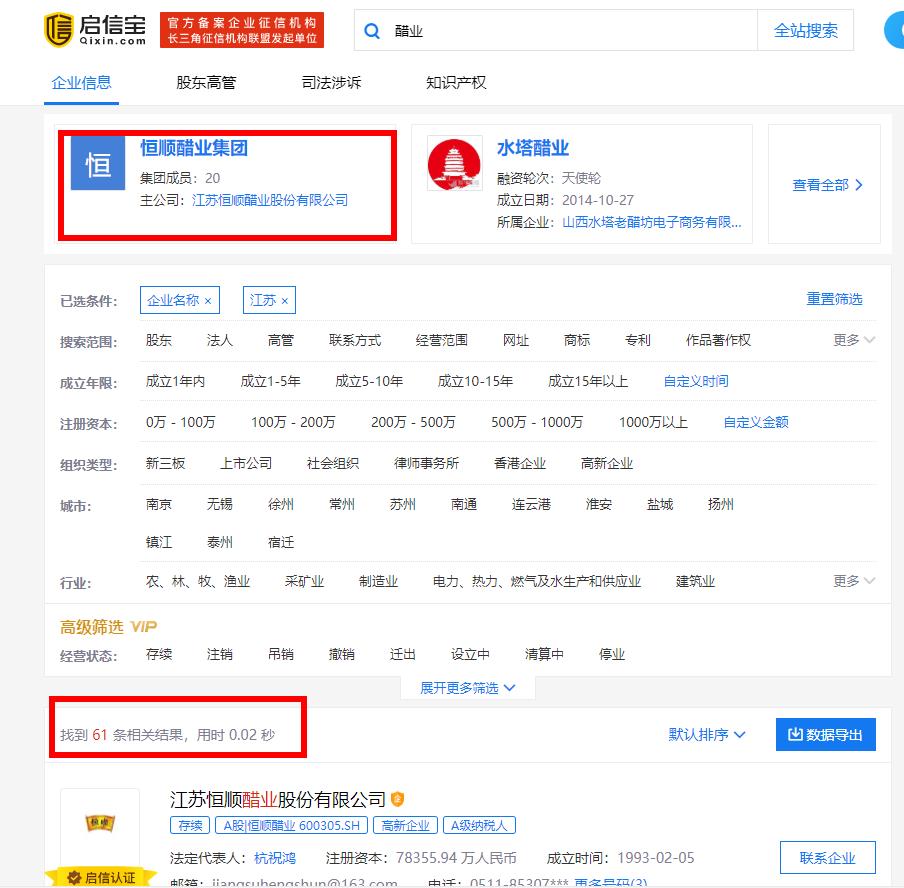 通过启信宝的数据我们可以发现,在中国以醋业为关键词命名的公司中,全国有多达1389家,而山西一省的醋业公司就多达597家,我们如果把这个范围放到江苏省的话就只有61家了,其中还有多达20家公司是恒顺的关联公司,看到这样的结果让人也真的不禁感叹真的是百家醋企比不过一个恒顺。那么,我们到底该怎么看这件事呢?