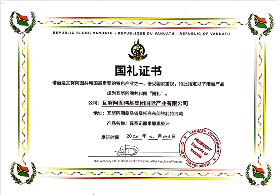 2020年年末,南太平洋岛国瓦努阿图也抓紧时机入局大健康产业。12月15日,瓦赛诺丽果酵素原汁正式登陆中国市场,并在产品发布会现场被正式授予"瓦努阿图国礼"的身份。这个由中国企业——伟基集团与诺丽康神共同打造的品牌,被寄予带来更多科研资源和品牌建设资源的厚望。通过双方的鼎力合作,将助力瓦努阿图诺丽产品从中国走向世界,融入全球市场。