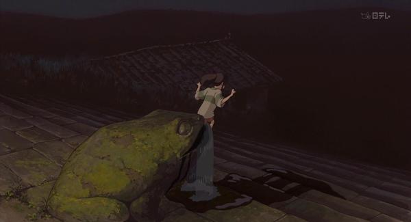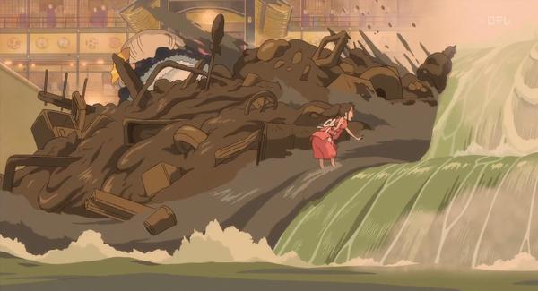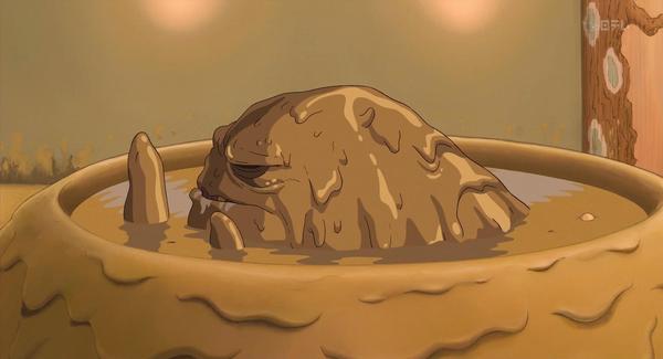 21.「腐れ神」也就是零落之神。日本高速经济成长时代(1950s-1973),经济快速发展,但是环境破坏严重(1960s-1980s),反映人们生活的变化,以及对河流的忘却,连神都零落了。千寻给洗澡的神是河神,这儿出现的是被人们污染的河神,垃圾,自行车等等,看出环境的污染破坏。但是并不是千寻自己把大神给洗干净的,这里有众人的帮助。