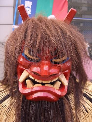 其实来自「なまはげ」,生剥节,是秋田县的民俗,青年头戴鬼面具祭祀。放一张图对比。