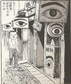 眼睛的是日语说法是「目」读作「め」,而「夢」读作「ゆめ」,联系到柘植义春的梦的故事以及看板的相似度,可以怀疑大师是用这儿的眼睛的招牌来指代这就像一个梦境。