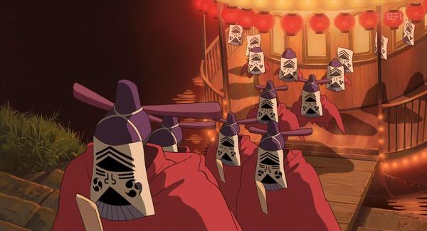首先说无面男现在的是一种鬼的形象,是绘画在扇子上的「ふすま絵の鬼」(大津绘)的形式。变成了一种无法满足自身欲望的鬼的形象,这正是日本的歌舞伎,神乐等一直的主题。