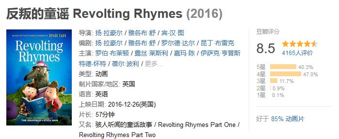 豆瓣8.5分,好于85%的动画片,这部号称“毁童年”的新童话,不仅被大家接受,而且还获得了今年的奥斯卡最佳短动画片的提名。