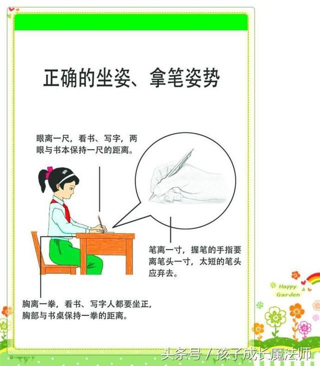 2.身直要做到以上要求,身子就要尽量坐正、坐直。胸口离桌沿的距离约在3寸左右(根据所写字的大小适当调节距离的远近)。不可紧贴桌面或弯腰驼背;