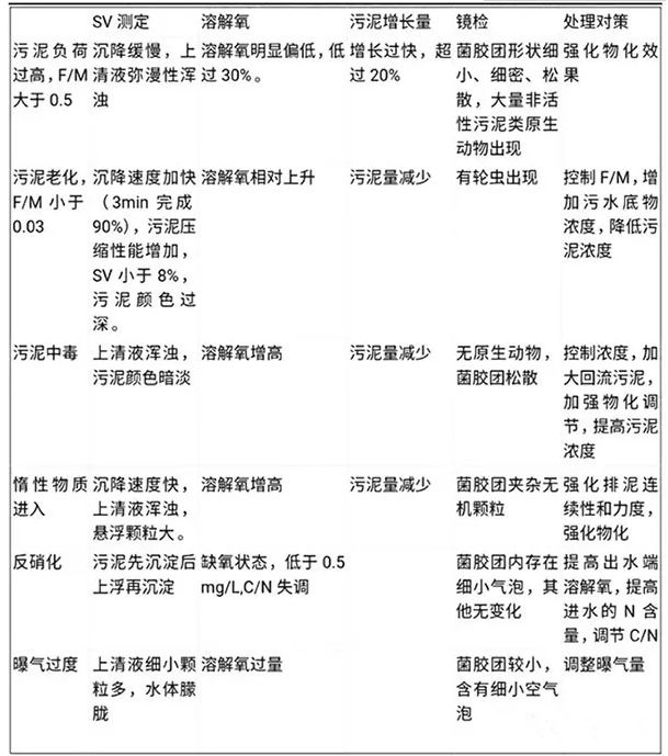 增加污泥回流或及时排泥,减少沉淀池内污泥;减少曝气量或时间,降低硝化作用;或者提高出水端溶解氧的含量。减少沉淀池进水量,以便减少进泥量。(2)污泥腐化问题:保证曝气设备低故障;降低污泥浓度;避免污泥冲击负荷丝状菌问题(3)丝状菌膨胀问题:丝状菌生长环境:pH 4.5-6.5,高温容易生长,要求较多碳源,对氧和磷要求较低 要求较多氧。与正常情况进行比较https://mmbiz.qpic.cn/mmbiz_png/kAONxmT9FWkP2Yz7LwIWMSPlicXsbDRfJ7OboXdK6Bte3ArQib1tom4wET8icwwLNdBt4dDYrK5kDXMMpbMVSlA2g/640?wx_fmt=png&tp=webp&wxfrom=5&wx_lazy=1&wx_co=1判断依据{在正常情况下,SV(10-30), SVI(50-150)。}https://mmbiz.qpic.cn/mmbiz_png/kAONxmT9FWkP2Yz7LwIWMSPlicXsbDRfJOe28Dtm3rTiadgZN4iafzczFuMTbMLc0LVhqKPsTfa19hUS4lbPrllmQ/640?wx_fmt=png&tp=webp&wxfrom=5&wx_lazy=1&wx_co=1丝状菌膨胀原因:外围原因:a)
