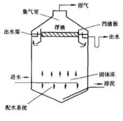 沼气以微小气泡形式不断放出,微小气泡在上升过程中,不断合并,逐渐形成较大的气泡,在污泥床上部由于沼气的搅动形成一个污泥浓度较稀薄的污泥和水一起上升进入三相分离器,沼气碰到分离器下部的反射板时,折向反射板的四周,然后穿过水层进入气室,集中在气室沼气,用导管导出,固液混合液经过反射进入三相分离器的沉淀区,污水中的污泥发生絮凝,颗粒逐渐增大,并在重力作用下沉降。