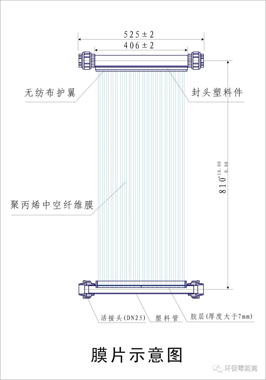 标准的MBR膜组件型号为MBR-8型。(8表示膜面积为8m2)。MBR-8膜片结构示意图如下: