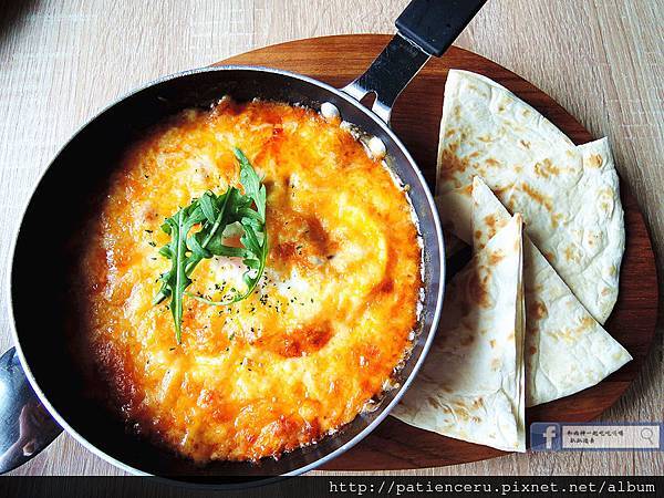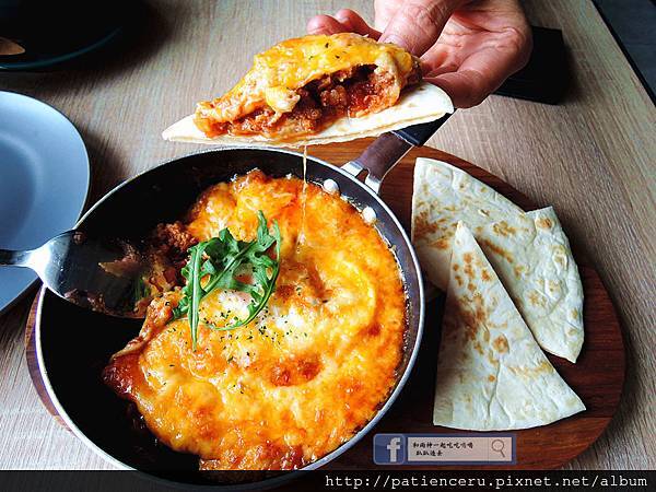 自制的辣肉酱,洒上起司再加上土鸡蛋一起烘烤,再搭配着口感还蛮Q的墨西哥烤饼吃,波费!实在太美味了!